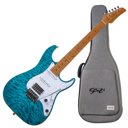 Guitarra SuperStrato com Corpo Quilted Maple sobre Mogno Captadores Seizi Jutsu Humbucker ALNICO V (Ponte) + Single ALNICO V x2 (Meio/Braço) HSS Ponte Flutuante 2 Pivôs com Alavanca e Acabamento Gloss (Acompanha Bag DeLuxe em Vinil)