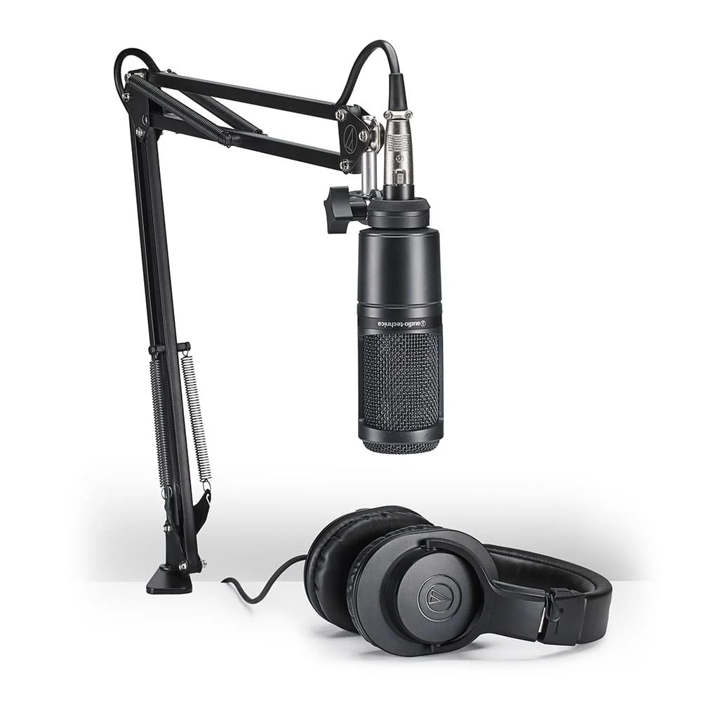 Microfone AT2020USB+, headphones ATH-M20x e braço boom com cabo USB integrado para setup profissional sem complicações.