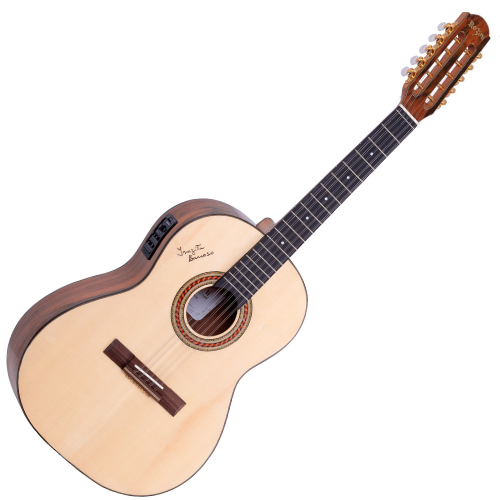 O tampo maciço em Spruce garante uma ressonância rica e um timbre brilhante, enquanto o corpo em jacarandá laminado proporciona um som encorpado e equilibrado. O braço em cedro oferece conforto e tocabilidade, permitindo que você explore todo o potencial da viola.